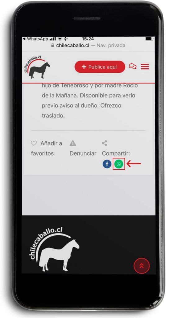 Al final del anuncio encontrarás los iconos para compartir por Facebook y Whatsapp. Debes hacer tap sobre este último icono.