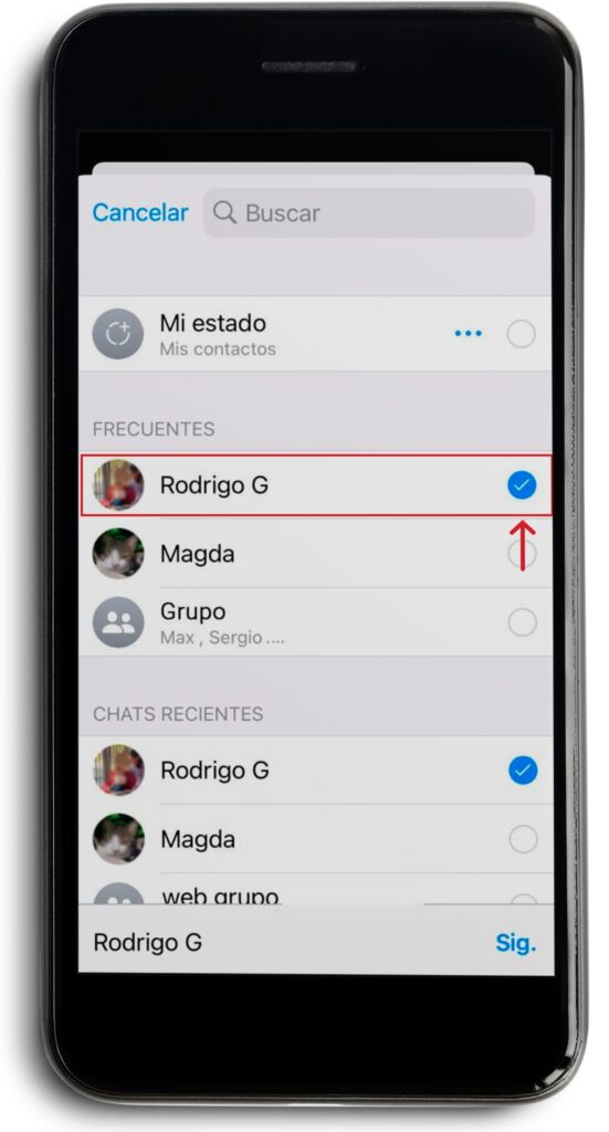 Ahora busca y selecciona los contactos a los cuales quieres compartir el anuncio.